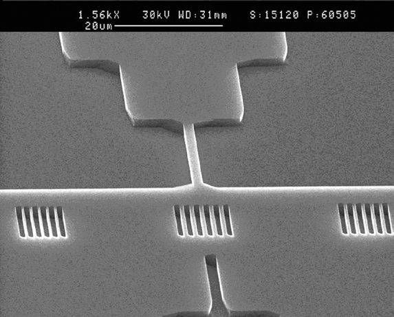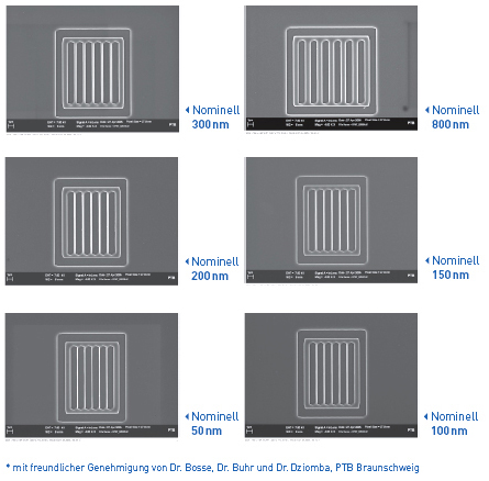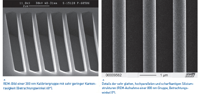 Substrate Material: <110> Si Chip size: 8×8 mm² Surface roughness: <1 nm Find structures Trenches in Si substrate·Depth: 1 µm Grid types 1-dimensional Grid size normally 10×10 µm² Line widths (CD) nominal: 300 nm, 500 nm, 800 nm Line width deviation along the lines (within a 10 µm long area): <5 nm 1σ Periods 1 µm + CD value Uncertainty of the main period: 3 nm 1σ Structure depth approx. 1 µm Edge radius <2 nm Edge roughness ± 4 nm (3σ) Flank angle 89° Line width standard
