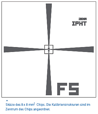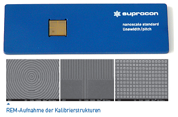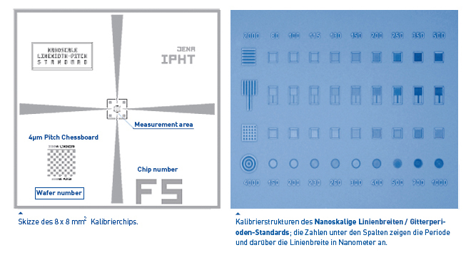 Substrate Material: Quartz Chip size: 8×8 mm² Layer Nanocrystalline silicon Thickness: 25 nm Chip holder Dimensions: 76×26×2 mm Material: Aluminium alloy, anodised Find structures Au Thickness: 100 nm Grid types 1-dimensional (line grid for x+y) 2-dimensional (cross grid) circular (circle grid) a separate individual structure for CD determination on one side of the 1-dimensional grid Grid size normally 10×10 μm² Line widths (CD) nominal: 80 nm, 100 nm, 115 nm, 130 nm, 200 nm, 250 nm, 350 nm, 500 nm, 2 μm Line width deviation along the line (within a 6 μm long range): 8 nm 1σ Periods 160 nm, 200 nm, 230 nm, 260 nm, 300 nm, 400 nm, 500 nm, 700 nm, 1000 nm, 4 μm Uncertainty of the main period: 3 nm 1σ Roundness of the circular gratings ± 0.6 % deviation from the main period in the x and y directions (± 1 nm for 160 nm gratings)