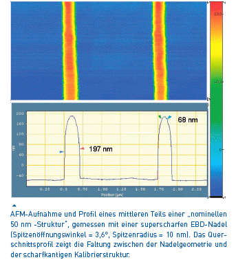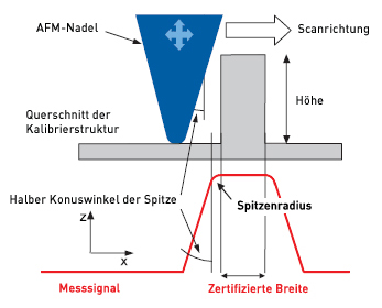 Substrate Material: <110> Si Chip size: 8×8 mm² Surface accuracy: <1 nm Find structures Trenches in the Si substrate Depth: 250 nm Grid types 1-dimensional Grid size approx. 10×10 µm² Line widths (CD) nominal: 50 nm, 100 nm, 150 nm, 200 nm, 300 nm, 800 nm Line width deviation along the line (within a 1 µm long area): <3 nm 1σ Periods 1 µm + CD value Uncertainty of the main period: 3 nm 1σ Structure depth 250 nm Edge radius <15 nm Edge roughness <5 nm (p-p) Flank angle 89° AFM tip characterizer