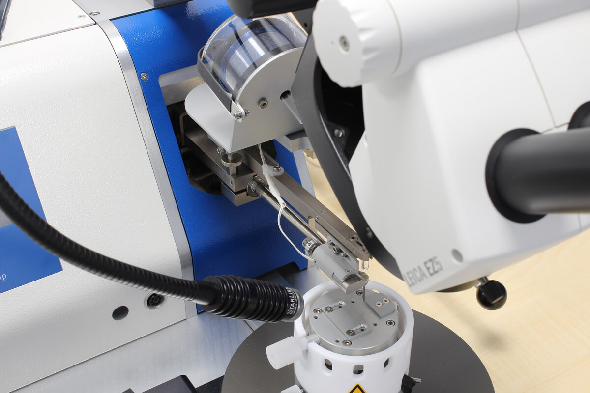 Bonding: Using a manual wire bonder, the wiring of an integrated circuit or functional chip is connected to the electrical terminals of the housing or to other components.