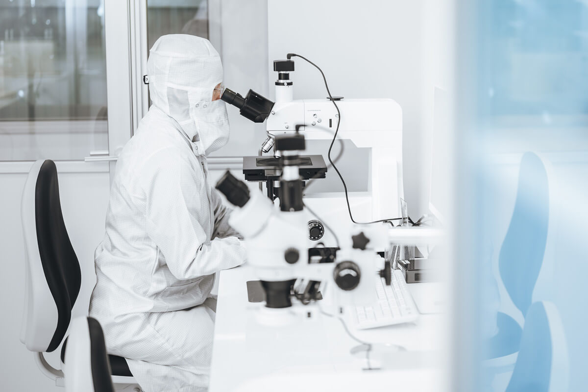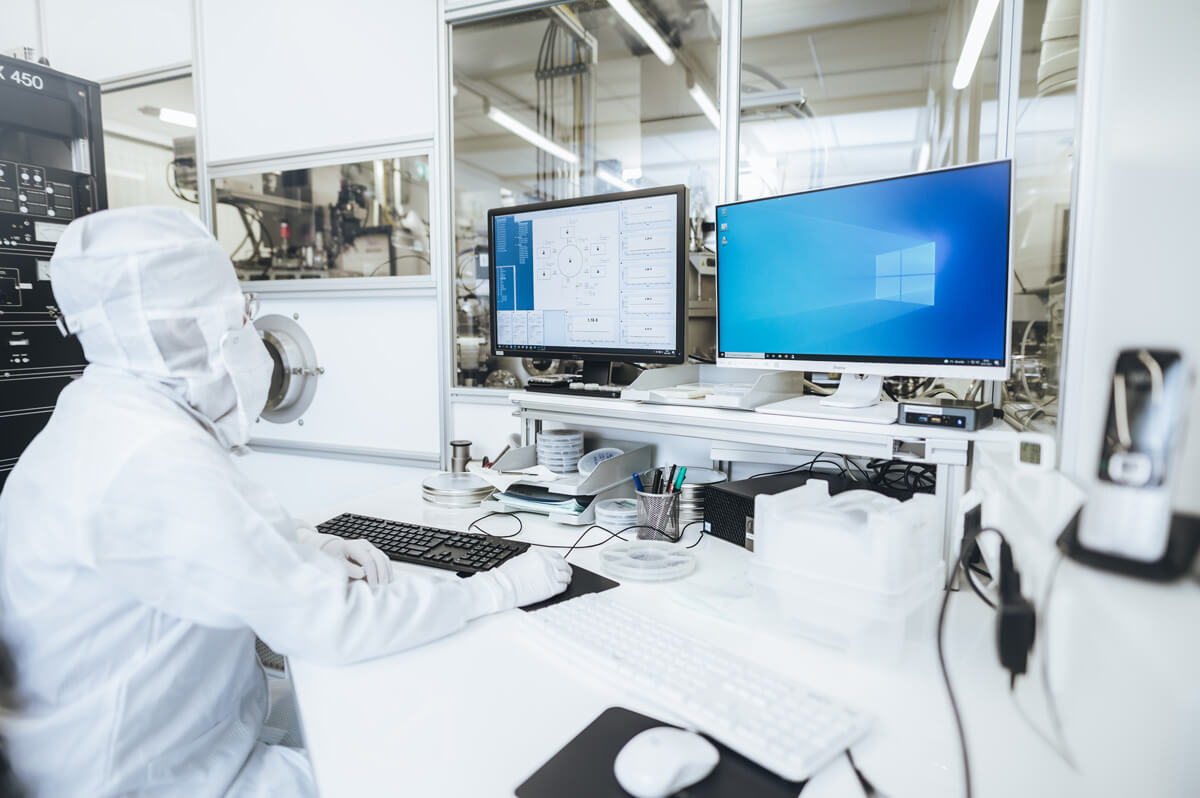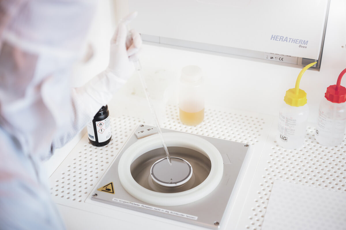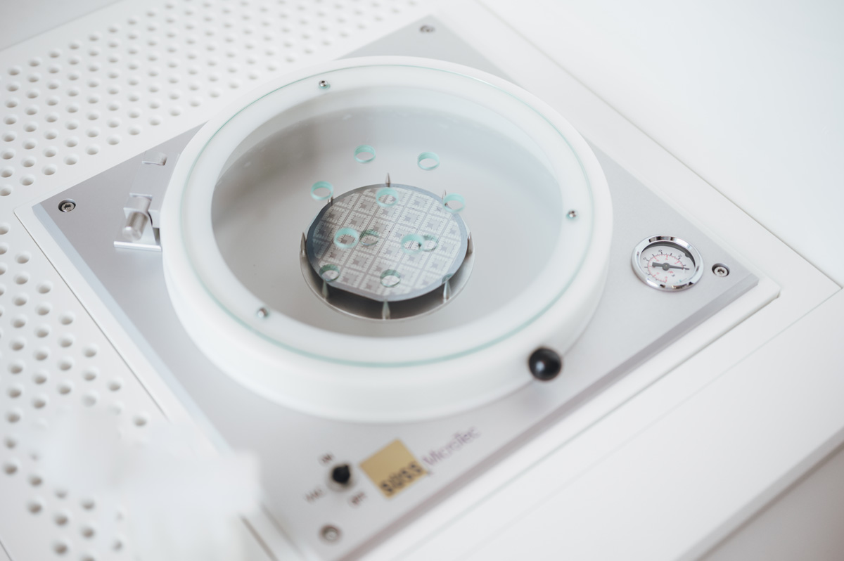 Through projection exposure of photomasks, a wafer stepper transfers structures onto the prepared substrates. In a subsequent step, the resist structure is inspected under a light microscope using a developer solution.