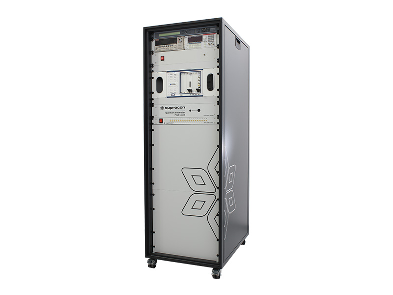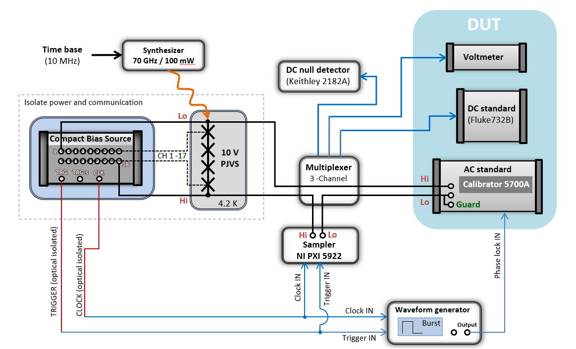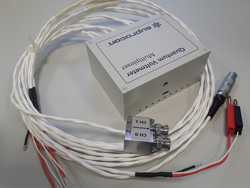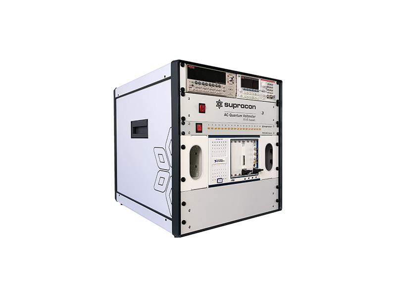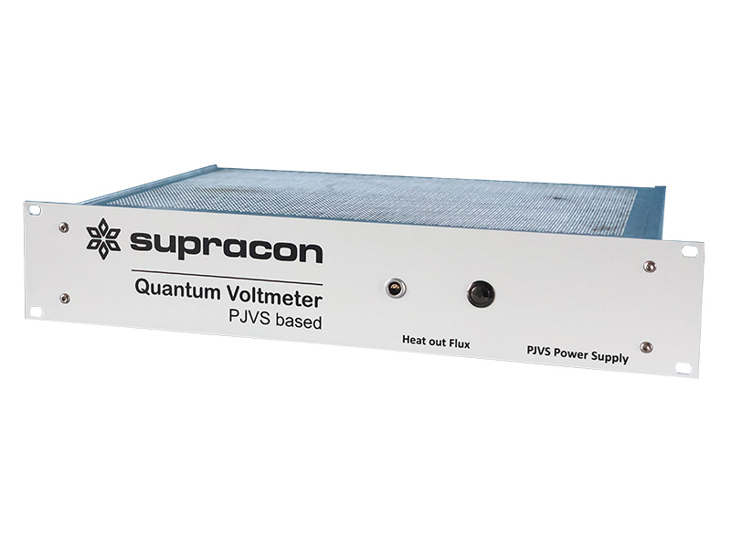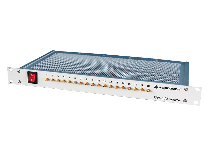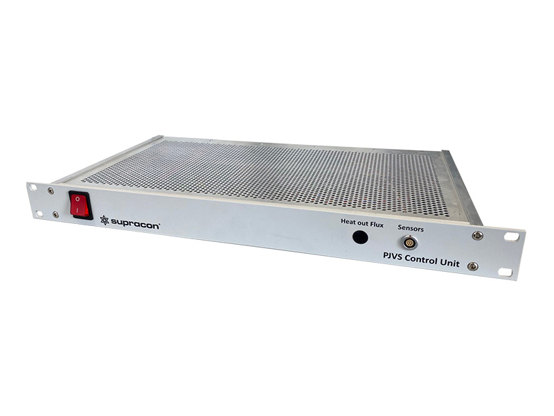 A Josephson voltage standard system consists of components specially developed by Supracon AG, as well as devices sourced from external manufacturers. The diagram illustrates these components along with their interconnections within the system. The Josephson voltage array manufactured in our cleanroom is cooled either with liquid helium or using a pulse tube cryocooler, also developed by Supracon AG. A dedicated compact bias source with an isolated power supply controls the PJVS array. In addition, our PJVS control electronics coordinate the multiplexer, cryocooler, and flip-chip heater for flux trapping removal, while also interfacing with sensors that monitor environmental conditions.